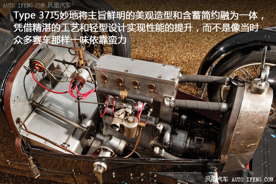 Type 37巧妙地将主旨鲜明的美观造型和含蓄简约融为一体,凭借精湛的工艺和轻型设计实现性能的提升,而不是像当时众多赛车那样一味依靠蛮力。它的1.5L单顶置凸轮轴发动机小巧与动力兼备,Type 37可轻松达到每小时140公里的速度,再加上其制动系统在当时也十分出色,所以这款车型一度被公认为国际系列赛事中稳操胜券的王牌。